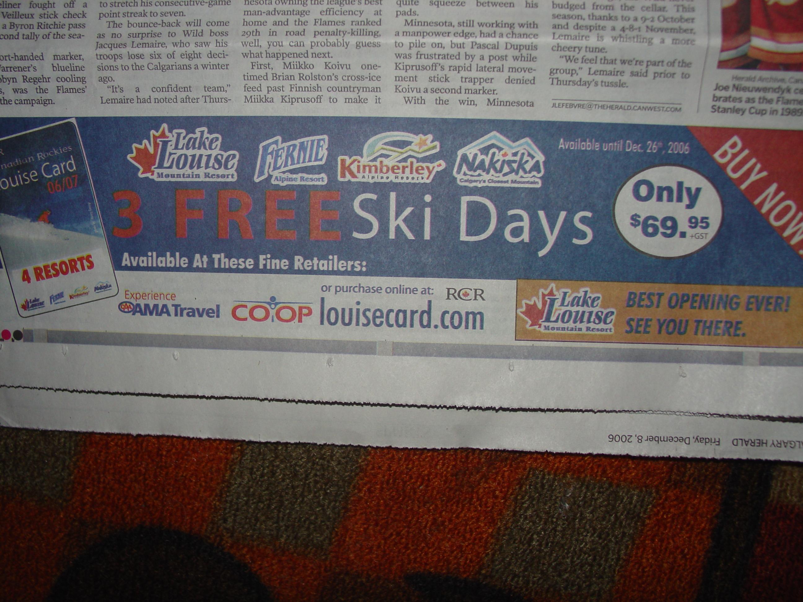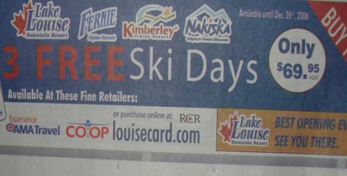 Yep: that's what it says: three days of free skiing for only $69.95. Oddly, you don't have to wear a red toque to qualify.